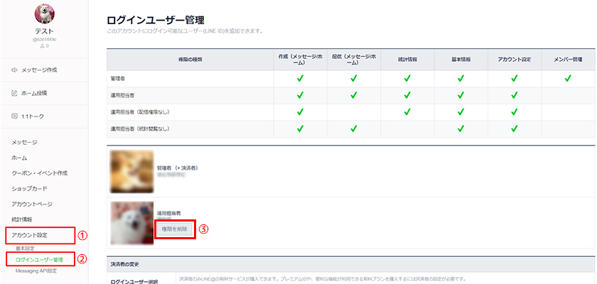 LINE@ の運用担当者が削除できない、または1,2で説明した手順のメニューが表示されないといった場合は下記の理由が考えられます。