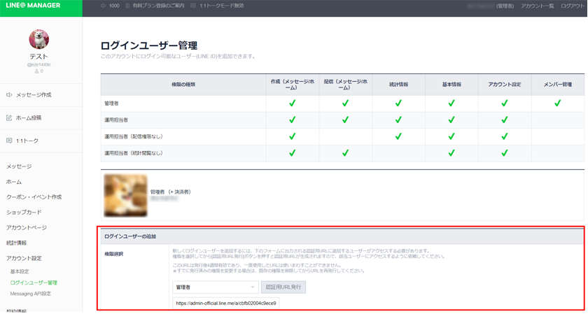 管理者:LINE@ のアカウントを最初に作成した人に与えられる権限。